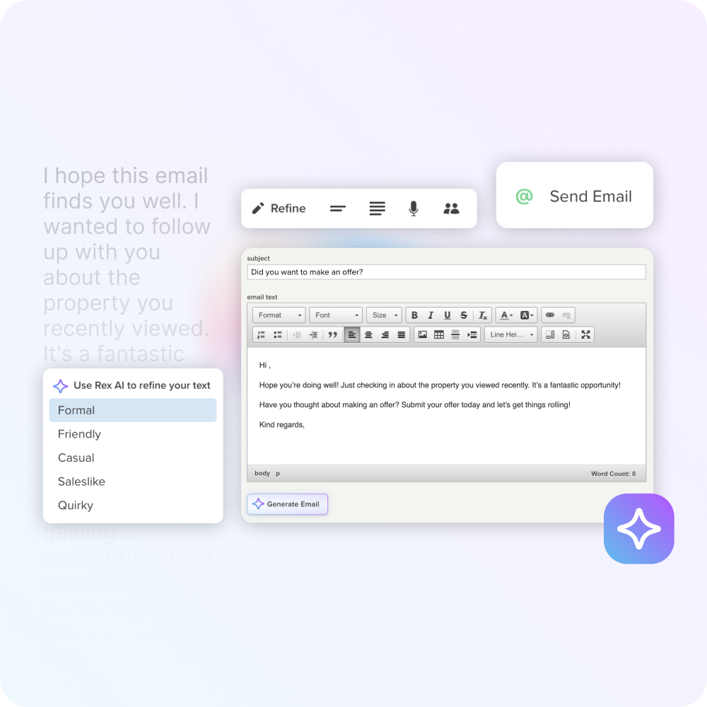Rex is committed to delivering the very best adaptions of AI for estate agents to adopt, saving you the confusion and effort of trying to adapt AI tools to your existing processes. Learn more about how we're implementing AI and making it easier for you to adopt AI tools in your business. You can save time on grunt work and make more time for action.